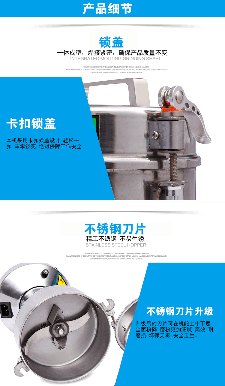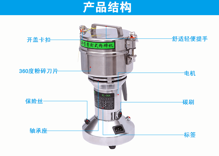 2、本机优点是:粉碎室和盖子未采用传统的螺纹旋合设计,采用密封圈密封免螺丝设计,操作更方便。避免了过去螺纹卡死的现象。