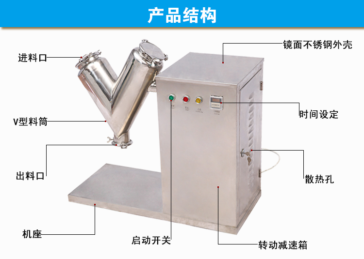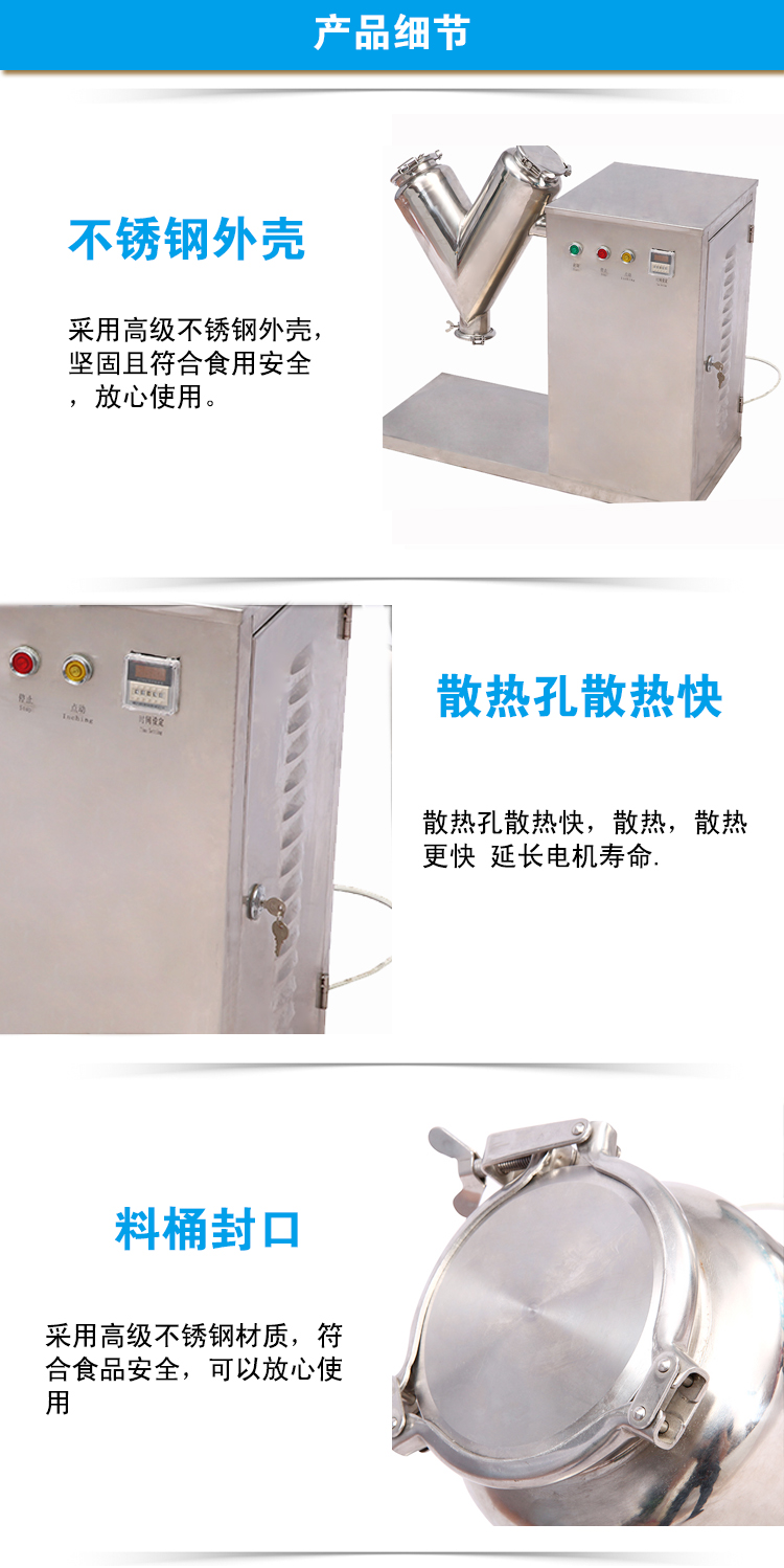 保持物料颗粒完好无损,本机混合筒采用不锈钢制造,对混合物料无任何污染。另外,本机还装有定时装置,可以控制