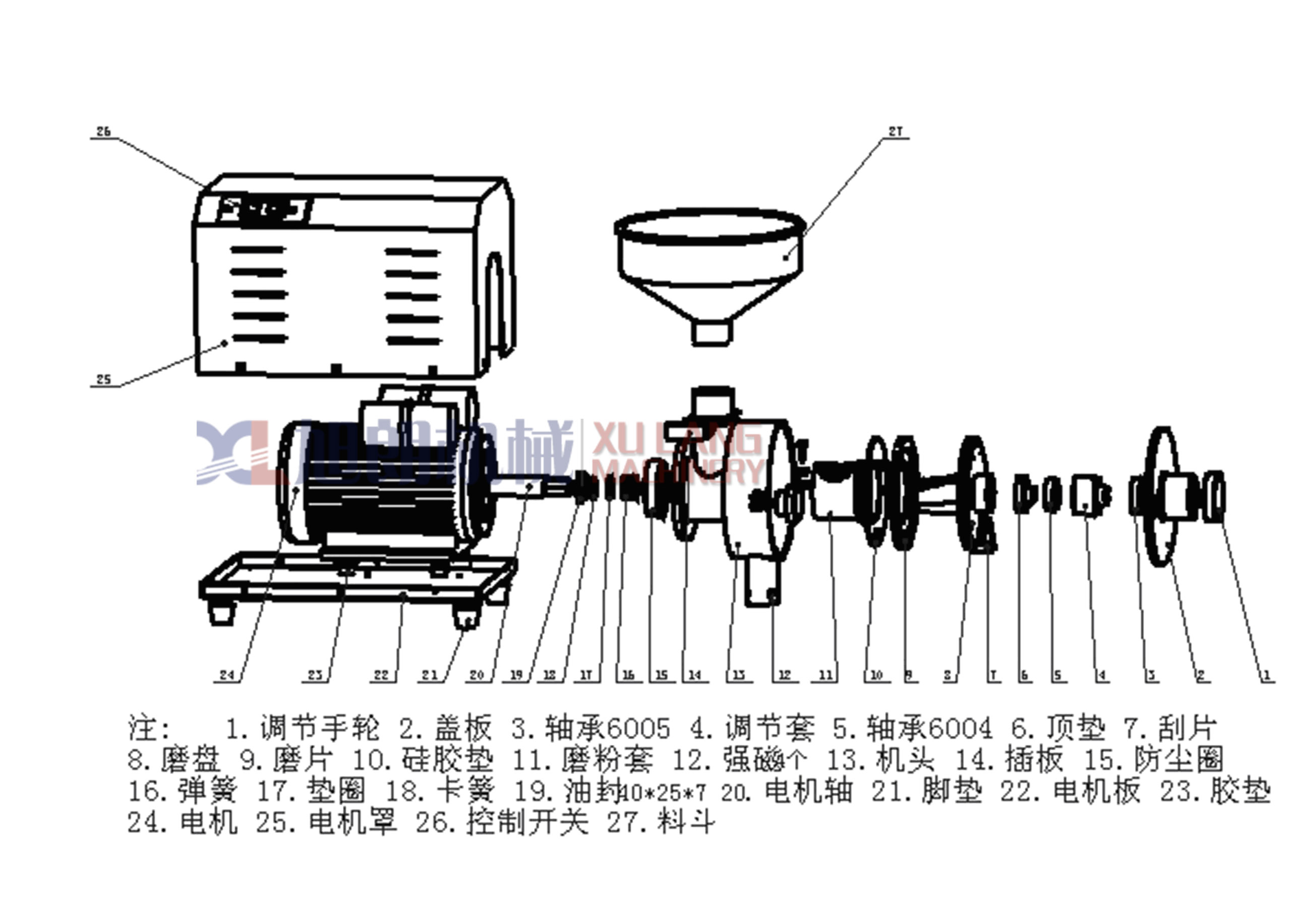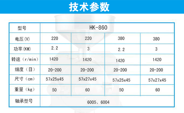 HK-860三亿在线(中国)唯一官方网站分解示意图 ![]() ![]() ![]() ![]() 一.860三亿在线(中国)唯一官方网站优势说明: 1、 860磨粉机不再采用低功率电机,220V有2.2和3KW两个功率,380V仅有2.4KW一个功率。新款磨粉机的电 2、 静磨片与机壁之间加装了硅胶垫,起到减震、微调磨片的效果,使两块磨片吻合更好,磨粉更细,噪音减弱。 3、 860磨粉机,电机与电机固定板之间,电机固定板底下,均加装橡胶垫,进一步加强减震和降噪效果。 4、 860磨粉机门盖和腔体之间,采用紧密加工方式,以台阶位配合方式,确保不漏粉,确保调节器顶垫和磨 5、 860磨粉机的粉碎腔坡度(即静磨片安装位),采用科学设计,进一步保证了磨粉的细腻度,达到进口即 6、 860磨粉机的调节器槽牙,采用高级机械加工中心,确保加工精密度,达到了方便调节、配合紧密、噪音 7、 磨粉机的磨盘装上磨片和刮片后,经过电脑动平衡检测,进一步保证了同心度和重心的平衡度, 8、860磨粉机的底座和电机之间没有轴承,便于客户拆装,又减少了故障发生,提升了机器品质。 9、磨粉机达到了出料顺畅、磨粉非常细腻、噪音和震动比老款小很多的效果。 860磨粉机,每台均配送价值200元的大礼包,含2副磨片(机器上本身自带1副)、不锈钢下料棒1根、 磨粉机的电机启动运转时,连接轴以及套在连接轴上的磨盘一起运转。待磨物料从料斗进入磨粉套,磨盘 三.技术参数 四.操作与调整 1、磨粉机应放置在水平、固定、结实的水平桌面或者台面上,厚实木更佳。 2、由于磨粉机电机在工作后会不断产生热量,所以磨粉机应放在宽敞通风处,有利于散热降温。如果 3、将机盖打开,再将磨盘固定在连接轴上,再用两个大拇指按压在磨盘上,如果磨盘能够自由伸缩,说 4、启动电源,运转1分钟左右,将物料放进料斗,将调节器拧至适当位置,打开下料挡板,使物料缓慢地 5、 磨粉的粗细取决于两块磨片之间的间隙,而磨片的间隙靠调节器进行控制,根据机盖上的粗细指示, 6、调节器的调节范围和力度该如何控制,可以通过耳朵听磨片摩擦产生的声音以及电机运转的声音来决 7、单独磨含油量特别高的物料如芝麻、核桃、花生等,因为这类物料的含油量特别高,只能磨成粗粉, 8、动磨片和静磨片的装卸:装在磨盘上的为动磨片,装在粉碎腔的为静磨片。将固定磨片的3枚螺丝取下 五.注意事项 1、使用前详细阅读使用说明书,严格按照操作规范操作机器,每次开机前,应检查静磨片、动磨片、刮片 2、磨粉机一定要外接断路保护(过载保护)装置,以保护电机和人身安全。 3、加工五谷杂粮、中药材等,应先烘干或烘熟,清除石块、金属等杂物。物料受潮变软或者发粘后,应该 4、每次使用机器结束后,应将机器内部清理干净,不得用水直接冲洗,并通风晾干。 5、严格按照规定接地线,电机应以逆时针方向运转,机器正常运转无异常、无异动、无异响时,方可操作 6、磨粉机需固定在牢固稳定水平的桌面和柜台上,才能最大地减轻震动和噪音。 7、在加工过程中,如因停电等原因突然停机,必须先关闭电源开关,再清除粉碎腔内的残余物料后,才能再 8、如发现机器零件有严重磨损或损坏时应及时进行修理或更换。 9、机器启动后,应待运转正常时才能放料加工,注意控制进料量,防止电机超载闷机。 10、机器较长时间不用时,应切断外电源,机器勿到置,要平放,上面不要放重物。 11、本机保修一年,人为使用不当引起的损坏,以及正常磨损,不属保修范围。需返回销售单位或者厂家进行 六.操作方法和技巧 (一)、操作方法 1、机器每天使用前必须检查机器是否运转正常、静磨片和动磨片的螺丝是否有松动,并加以拧紧。 2、磨干性材料 磨干性材料是需要磨两次,第一次粗磨,第二次细磨。 第一次粗磨时,调节调节螺丝至磨片有轻微的吱吱摩擦声音,再往粗回调节到刚刚没有摩擦声,然后打 3、磨干性加油性混合材料 方法一 磨干性加油性混合材料时需要磨两次,第一次粗磨,第二次细磨。 第一次粗磨时,调节调节螺丝至磨片有轻微的吱吱摩擦声音,再往粗回调节调节螺丝一圈,然后完全打开 第二次细磨时,调节调节螺丝至磨片有轻微的吱吱摩擦声音再打开下料口插版1/4-1/3即可。 方法二 第一次将干性材料细磨(与磨干性材料操作方法一样)。 第二次将已经磨好的干性材料与油性材料混合均匀,在调节调节螺丝至磨片有轻微的吱吱摩擦声音,然后 4、磨含糖份高的材料 磨含糖份高的材料时,(比如红枣、金桔片、枸杞等等)糖份高的材料需烘焙干,去水份,或速冻两个小时 5、磨含糖份高的混合材料,操作方法和磨干性加油性混合材料操作方法相同。 (二)、更换磨片 1、拆下旧磨片(磨片有正反面,静磨片和动磨片可以调换使用)。 2、安装好磨片,调整磨片内孔与粉碎套或动磨盘安装位置的缝隙均匀再拧紧螺丝。 3、调节磨片的平整:开启机器,调节调节螺丝至磨片发出非常刺耳的声音,运行20-30秒钟左右,停机打开 (三)、磨合磨片 1、取2-3斤大米放入漏斗,启动机器调节调节螺丝至磨片刚刚有轻微的吱吱摩擦声音,再往细调节调节螺丝 七.常见故障及排除方法 故障现象 故障原因 排除方法 电机不能启动或启动困难 导线直径小,电压过低电容损坏 更换适当导线待恢复电压后再启动 电机无力 温度台高 电机绕组短路或电机轴承损坏,长期超负荷运转 检修电机,更换电机轴承,按额定负荷工作或暂停 