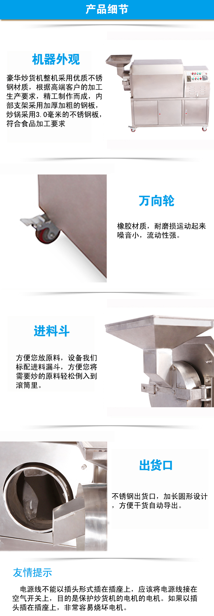 内部支架采用加厚加粗的钢板,炒锅采用3.0毫米的不锈钢板,符合食品加工要求。配高端电器元器件,整机外观豪华高 档,运转平稳,加热迅速均匀,炒货效果一流,是市面上最高档、最好用的豪华炒货机。本着服务广大客户的宗旨,价 格不高!方便、实用、高效! ![]() ![]() ![]() ![]() 1.三亿在线(中国)唯一官方网站最新推出的豪华炒货机采用优质不锈钢材质,独特的滚筒卧式结构,加热均匀,密封性好,焖炒效果特别好。同时